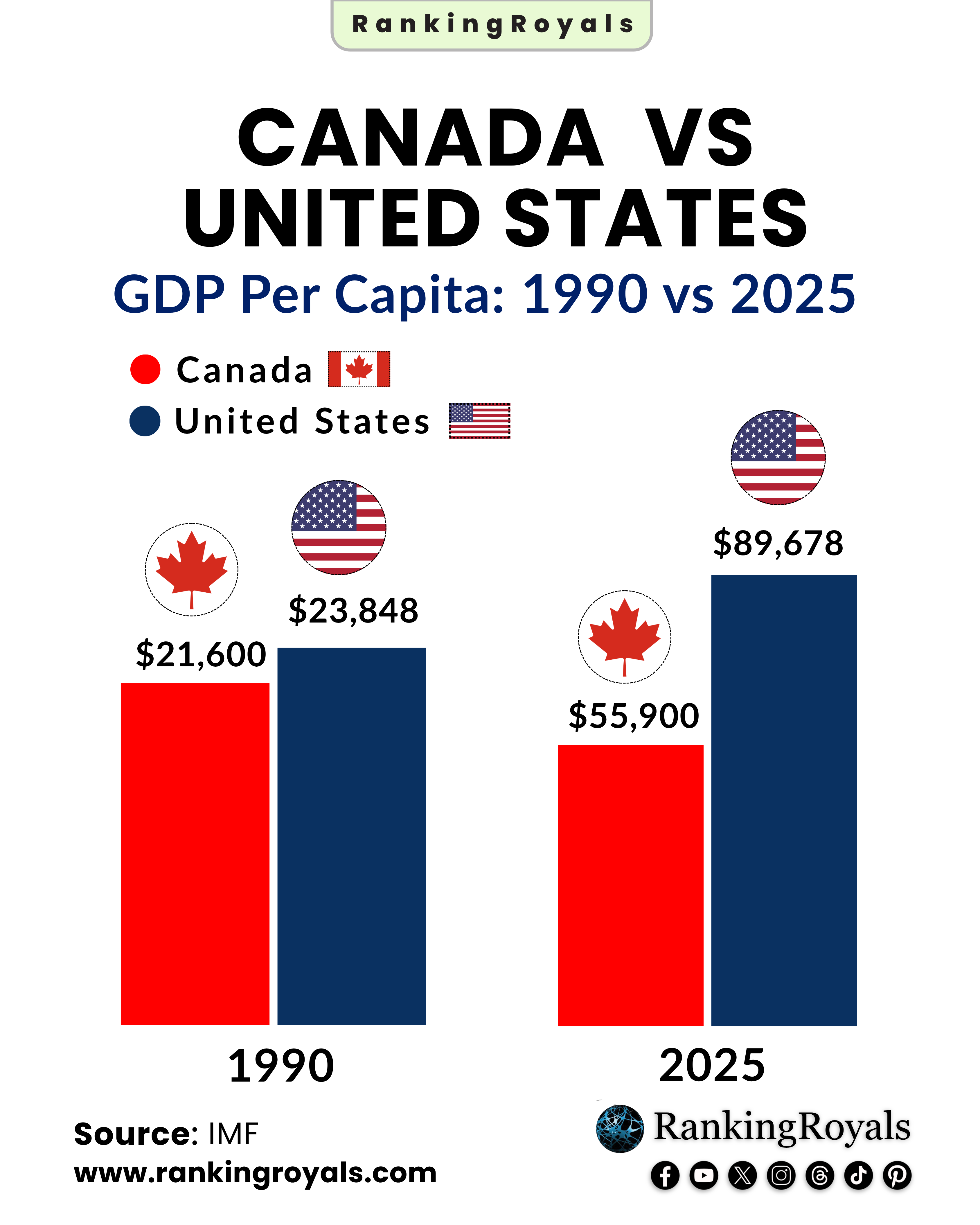 Canada’s economy is resource-rich and stable but faced headwinds from commodity price volatility and a smaller domestic market. On the other hand, the United States (the largest economy in the world) benefits from greater population growth and innovation-driven sectors.